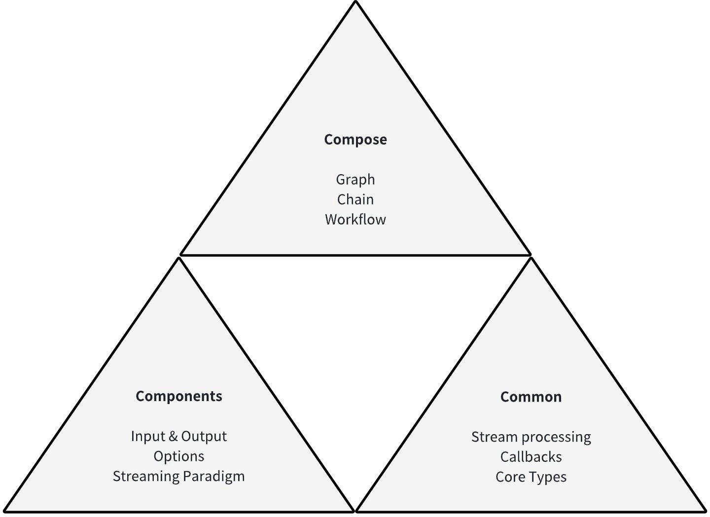 We believe there exists a common component list that collectively forms the common parts of LLM applications. Each component type, as an interface, has a complete and stable definition: specific input/output types, clear runtime options, and explicit stream processing paradigms.